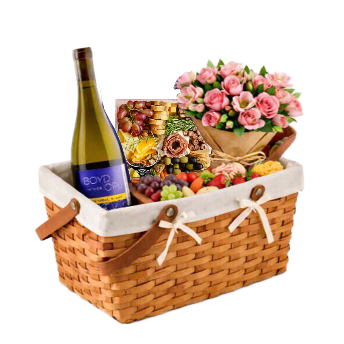 Indulge in the ultimate outdoor dining experience on our new patio. This curated basket is designed for two and includes:
