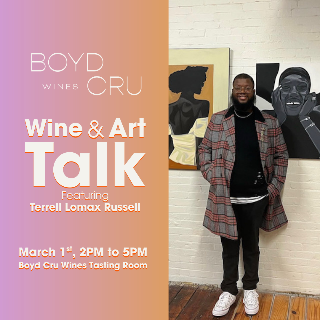 This March, we’re honored to host Terrell Lomax Russell for an afternoon of deep dives and fine wines. Known for his ability to capture raw emotion and cultural narrative through his striking use of color and form, Terrell’s work invites you to look closer.